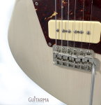 Check out this super early serial number Grosh Electrajet in Mary Kay white. I'd guess that this one is about a 2007 or 2008? What a beauty, and man, does it sound good. This one sports P90s (assuming they are Grosh G90s) and a tortise pickguard, but there is a cream guard included. Comfy weight at 8 pounds 1 ounce, balances perfect and plays like you'd expect. This one does show some play wear, most notably some little dents and dings throughout - it was played, but definitely not abused. Frets have plenty of life and the neck/fretboard are spotless. These are just great guitar. Includes the original hardhshell case with a few scuffs, and the back plate is included. Awesome chance to grab an early EJ for a great price.